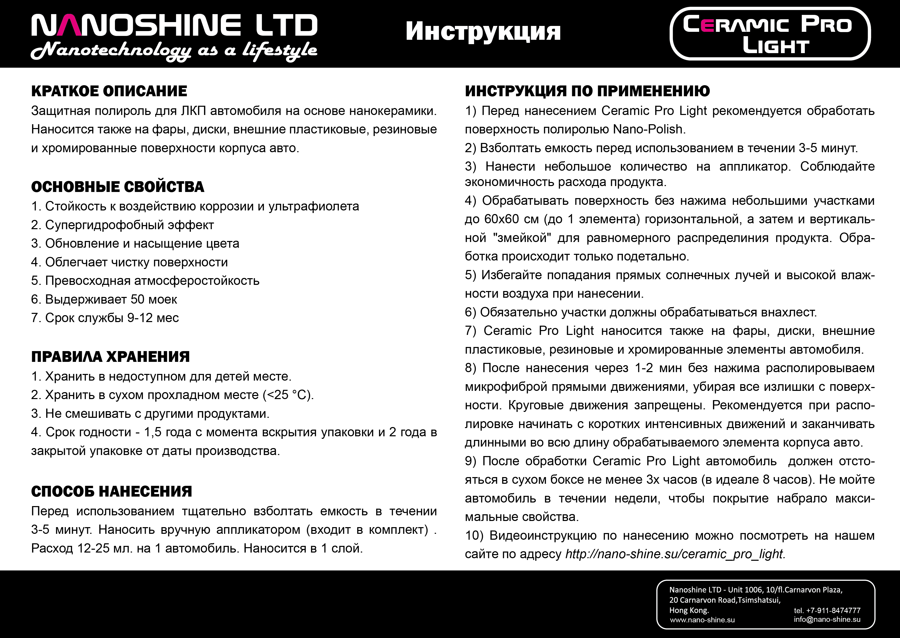 - Перед нанесением Ceramic Pro Light рекомендуется обработать поверхность полиролью Nano-Polish (см. инструкцию).